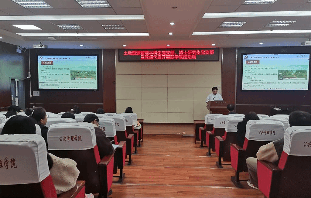 土地资源管理本科生党支部与博士研究生党支部于人文楼M115举行十一月联学联建主题党日活动,会议围绕二十大精神进行领学分享与心得讨论,教师党员赵微老师参会指导。赵万民同志主持。