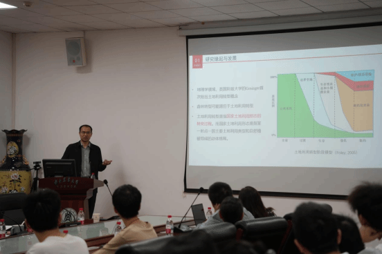 讲座伊始,张老师从土地利用转型研究的起源与内涵切入,追溯至苏格兰地理学家Mather的森林转型假说,阐释了森林转型是森林砍伐与恢复速率综合作用的结果,而人口增长率下降、农业技术进步等多重因素是其背后关键驱动。随后,他详细解读了土地利用转型的概念,即国家土地利用形态的转变过程,涵盖土地利用类型和自然植被组成的总体格局变化,并进一步剖析了土地利用转型与土地资源管理的互馈机制,指出经济社会发展促使土地利用形态发生趋势性转折,包括空间形态与功能形态的转变。