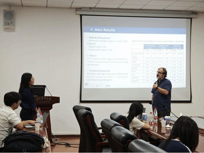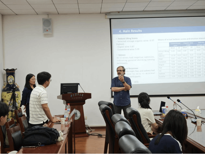 最后,Gil教授围绕研究结果提出了实践建议。鉴于情绪对有机酒等信任属性产品的强影响力,企业可通过强化积极情绪信号优化营销,例如在传播中突出有机酒的自然、健康等属性,简化酒标专业术语以避免引发消极感知。未来,他们团队将进一步探索积极情绪偏爱特定产品属性的深层原因,以及如何优化情绪测量技术来推动情绪经济学在农业食品领域的应用。讲座尾声,与会师生就表情捕捉技术应用、论文构思等具体问题与Gil教授进行了深入交流。