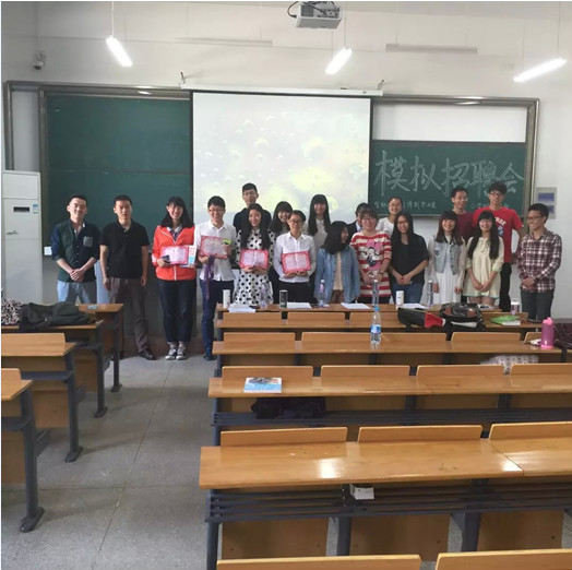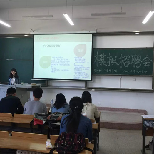 本次模拟招聘会面向本院所有大一新生,比赛先由选手事先递交个人简历,并准备ppt等向评委展示,评委根据选手简历的制作,ppt的展示,以及问答环节的表现,对其进行评分。根据四个评委的评分取平均为选手的最终分数。并以此评出一二三等奖共六名同学。据悉,本次模拟招聘会的评委分别是乔博斯职业装的高级经理、外院生涯部部长、以及两位优秀的学长。主持人由生涯部副部龚伟担任。