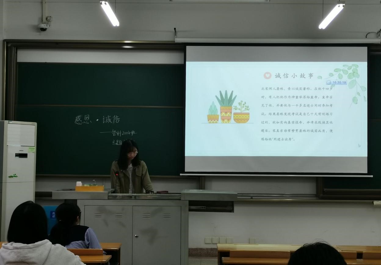 管理科学与工程类2001班和2002班联合开展了以“立做诚信之人,心怀感恩之心”为主题诚信感恩教育班会。管科2002班长鲜智鹏以一则幽默而深刻的短片切入正题,视频中出现的因作弊而忏悔的学生和随时间流逝而老去的父母,引发了同学们对于“诚信”和“感恩”的深刻思考。鲜智鹏表示:不信不立,不诚不行。我们强调“诚信”与“感恩”不仅仅是为了遵守法规、合乎伦理,更是为了培养大学生高尚正直的理想信念和价值取向,时刻以诚信感恩之心待人处事,铭记信以立志,信以守身,信以处世,信以待人。