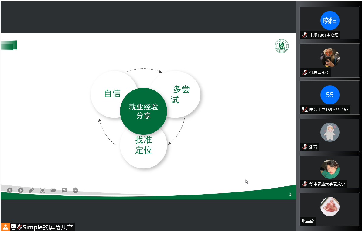 在土地资源管理专业的联合就业分享会中,几位通过秋招和春招找到工作的同学结合自己与身边同学的经验,给大家讲述了在求职中遇到的挫折和困难,分享了其就业策略,包括填写简历、网申、笔试、面试等技巧,为还在寻找工作的同学提供了指导。