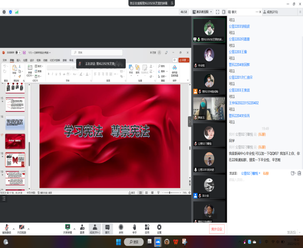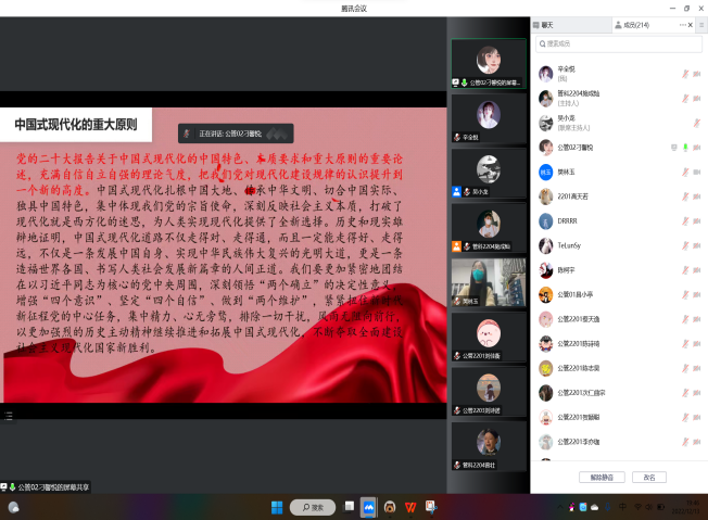公管2202班刁馨悦介绍了“中国式现代化”的五个重要特征和九个方面的本质要求。公管2203班刘诗诺讲解了“中国特色大国外交理念”,向大家展示了我国对外鲜明的中国特色、中国风格、中国气派。管科2202班宋艺雯分享了“学习宪法,尊崇宪法”的有关内容,鼓励大家尊法守法学法用法,争做“宪法卫士”。管科2204班曾壮则带来了对志愿服务的赞扬、倡导和读书分享,他讲到:青春年华,流年似水,让我们珍惜青春,做一些有意义的事情。