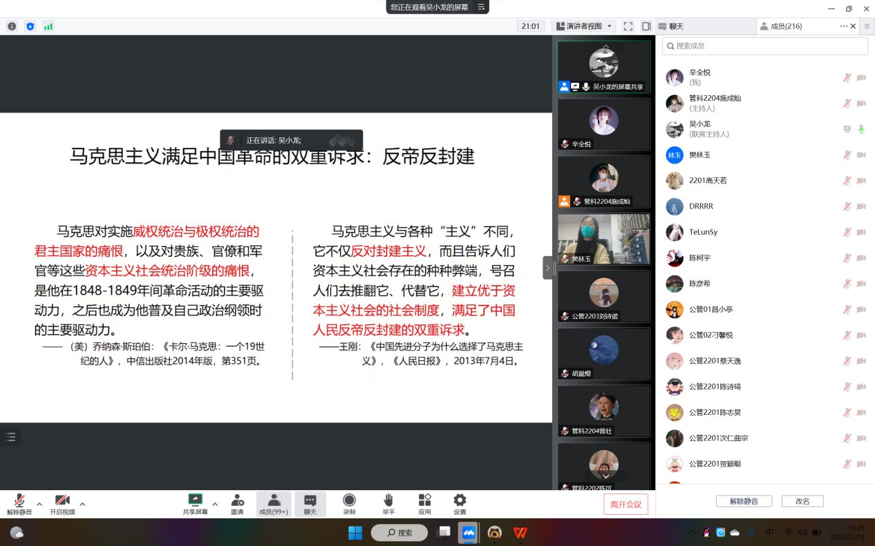 师生共同学习。吴小龙老师就如何深刻理解马克思主义中国化、时代化进行分享。他讲到:深刻理解马克思主义中国化时代化之为什么行,就要立足马克思主义与中国优秀传统文化的主客体关系,还要放眼马克思主义中国化时代化的历史发展逻辑,从而更深刻地认识马克思主义中国化时代化的深远意义。吴老师鼓励同学们要培育谦虚、宏博的胸怀,要有自主学习意识,为实现中华民族伟大复兴而不懈奋斗。