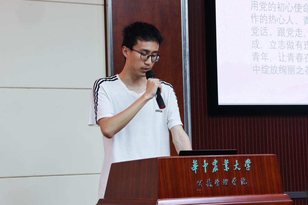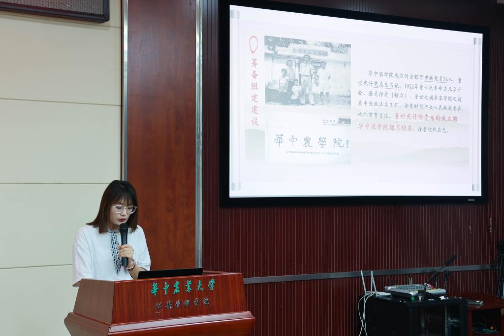 行管2102班苏珊珊深入挖掘了我校第一任党委书记童世光先生的事迹,展现了一位“一身正气、两袖清风、鞠躬尽瘁、死而后已”的榜样形象。童世光是党派到学校的第一任负责人,1952年院系调整时,他是学校的主要组建者;1954年他组织全校开展防汛斗争,战胜了洪水对学校的威胁;1955年他主持选定南湖狮子山为学校校址,带领师生开展艰苦的建院工作。“去做事关中国人吃饭这件比天都大的事情”,她分享了童世光在筹备组建学校建设时毅然回到华农、致力于为培养新中国的农业科技人才和推动农业发展时说的话,并号召同学们要向前辈学习,继续发扬团结一致、艰苦奋斗、勤俭建校的校风。