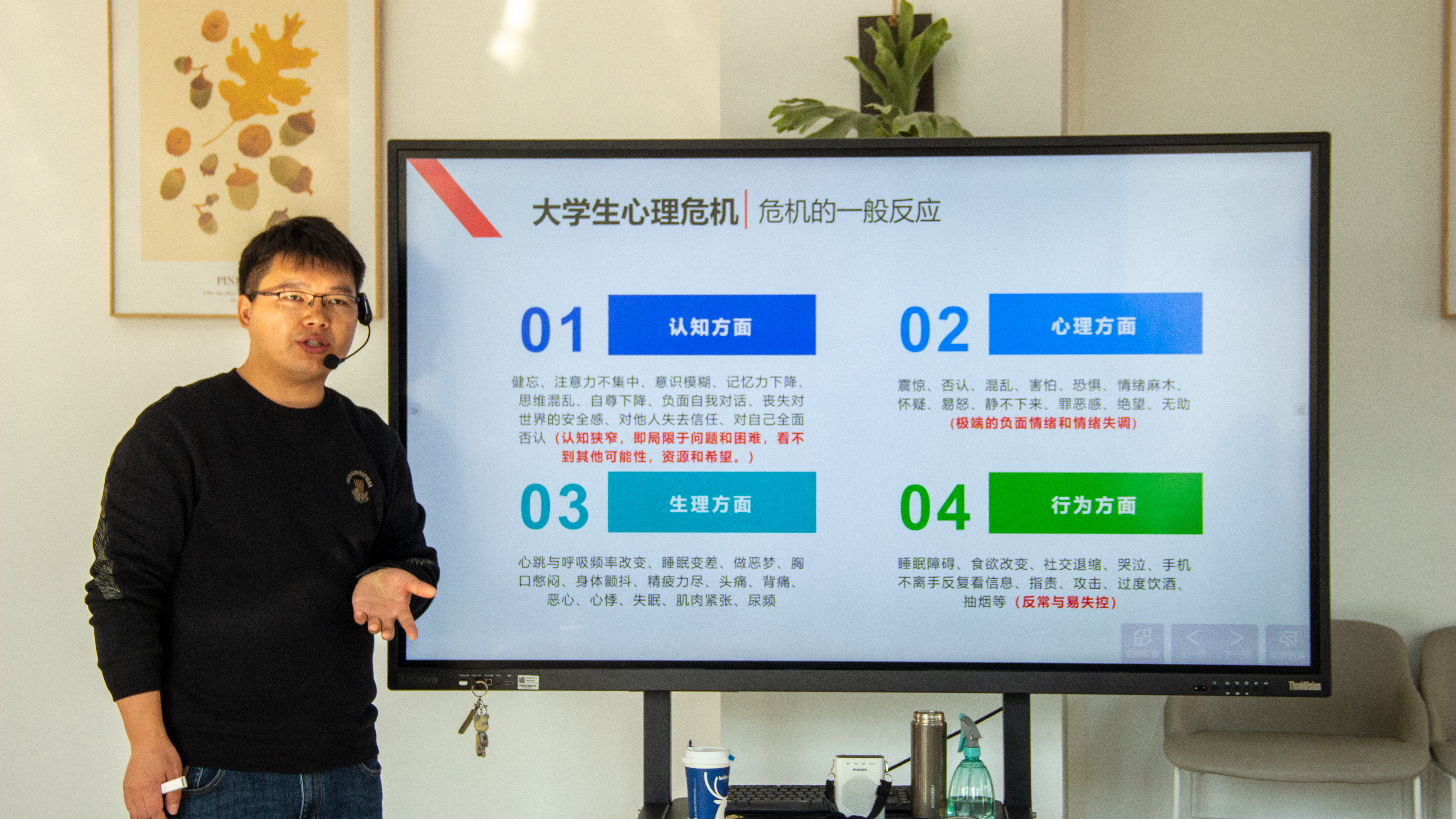 余金聪老师通过相关数据的分析,解释了心理危机的产生机制。他指出,心理危机通常涉及认知、心理、生理和行为四个方面。其中认知指认知狭隘,面对困难看不到希望,心理方面指极端的负面情绪和情绪失控,生理方面指心跳与呼吸频率加快或者经常做噩梦、恶心等疾病的突发,行为方面是指反常的或易失控的行为的出现。余金聪老师表示我们要培养积极的危机处理观念:危机避无可避,正确的方式是直面危机而非逃避。其中心理危机的三种情况有:一是有严重的应激反应;二是有中度及其以上的精神障碍;三是有明确的自杀或者伤人的倾向。对于同时出现这三种情况的学生,需要重点关注。