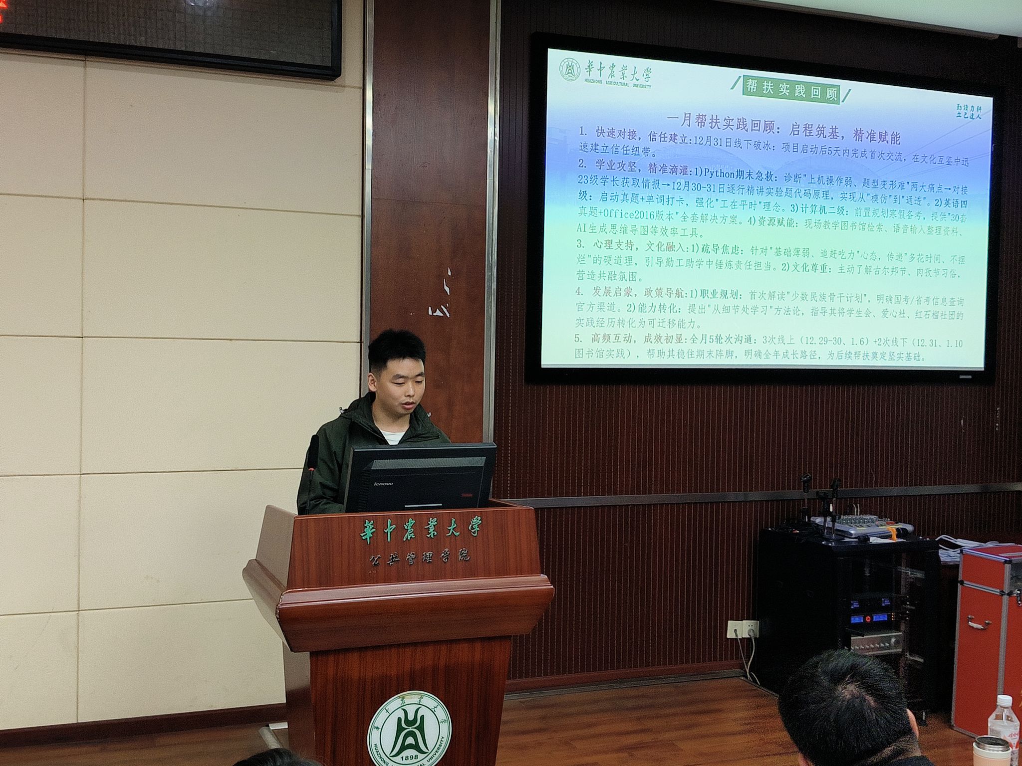 述职环节中,16位学生导师依次汇报了本学年帮扶工作开展情况。工程管理专业2022级本科生唐艳从学业帮扶、生活关怀与综合发展三个维度系统梳理了帮扶实践,通过推荐学习资源、鼓励参与竞赛、分享生活经验等方式,助力低年级学生适应大学生活、明确发展方向。土地资源管理专业2025级博士研究生李豪杰以时间为轴,回顾了与帮扶对象共同成长的历程。他强调“帮扶没有万能公式”,需因材施教、尊重差异,并分享了累计3.75万字的帮扶记录,体现其持续跟进的责任与细致。农村发展专业2024级硕士研究生于融雪则谈到,导师应以身作则,注重培养学生的自主学习能力与长远规划意识,实现“授人以渔”的育人目标。
