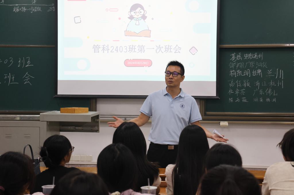“何为幸福的公管人?”在公共管理类2401班,院党委书记周向阳的问题使得刚报道的新生们投来了好奇的目光,他深情解答:“人生有很多事情要去做、很多挑战要去完成,而作为幸福的公管人,我们要面带笑容、满怀喜悦地去对待这些未知。”他还指出,所谓幸福就是人的本质力量不断发展的过程,幸福公管存在于每一天、每一时、每一刻,希望大家在未来的生活中细细品悟。