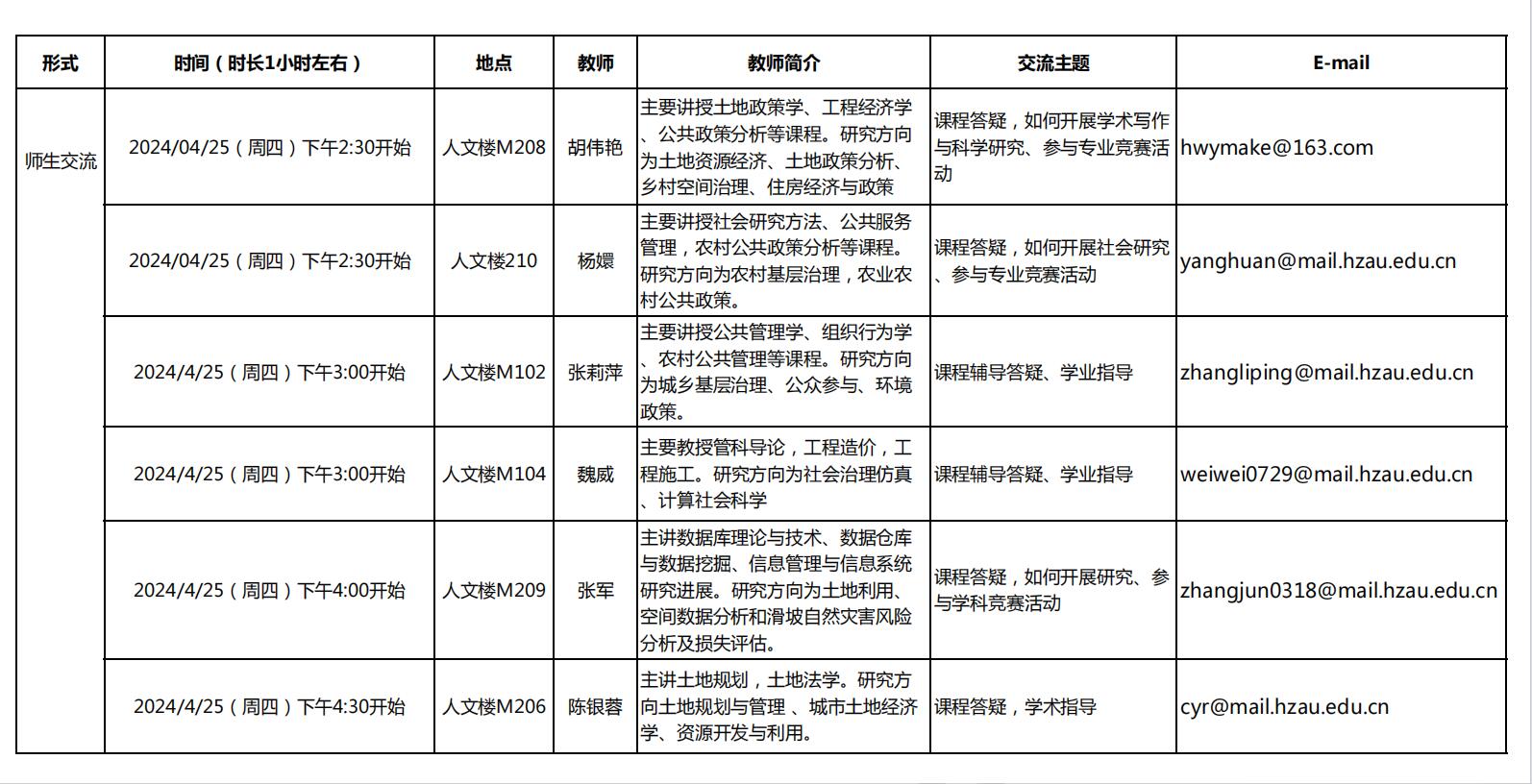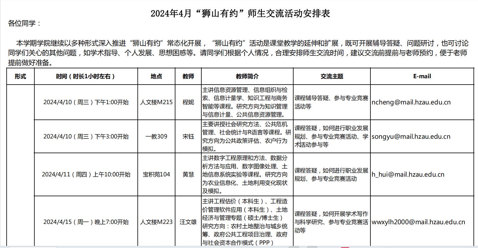 各位同学: 本学期雷速比分网 继续以多种形式深入推进“狮山有约”常态化开展,“狮山有约”活动是课堂教学的延伸和扩展,既可开展辅导答疑、问题研讨,也可讨论同学们关心的其他问题,如学术指导、个人发展、思想困惑等。请同学们根据个人情况,合理安排师生交流时间,建议交流前提前与老师预约,便于老师提前做好准备。
